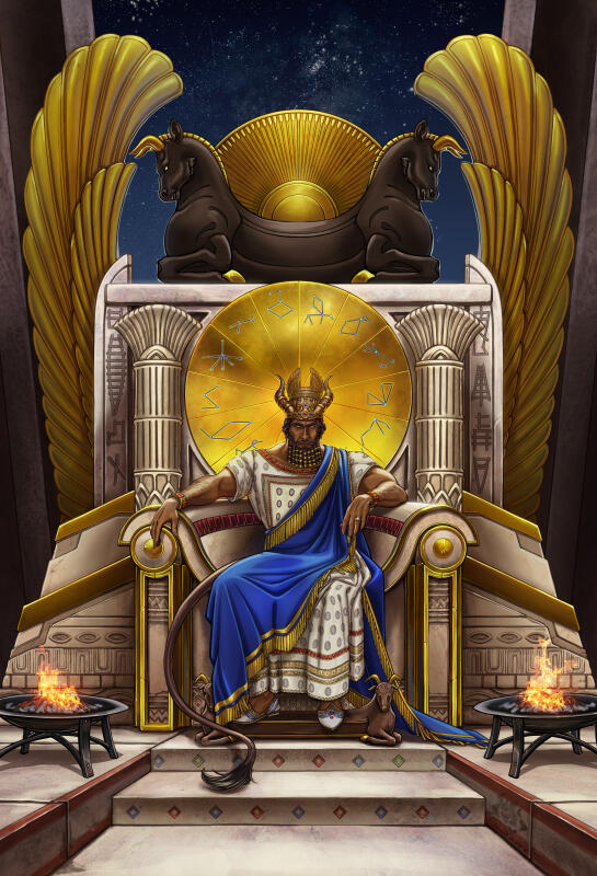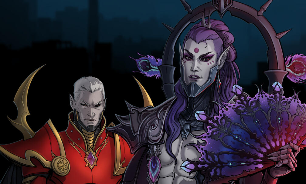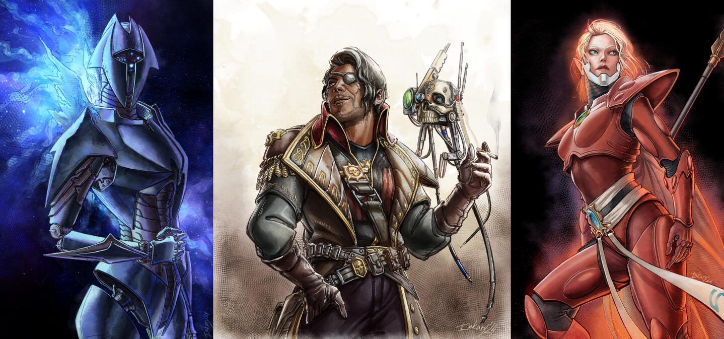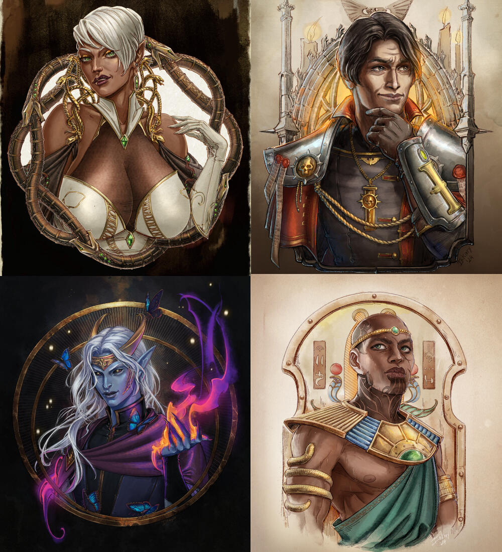 Illustration is a half-body or a full-body image of a character on an elaborate, detailed background.